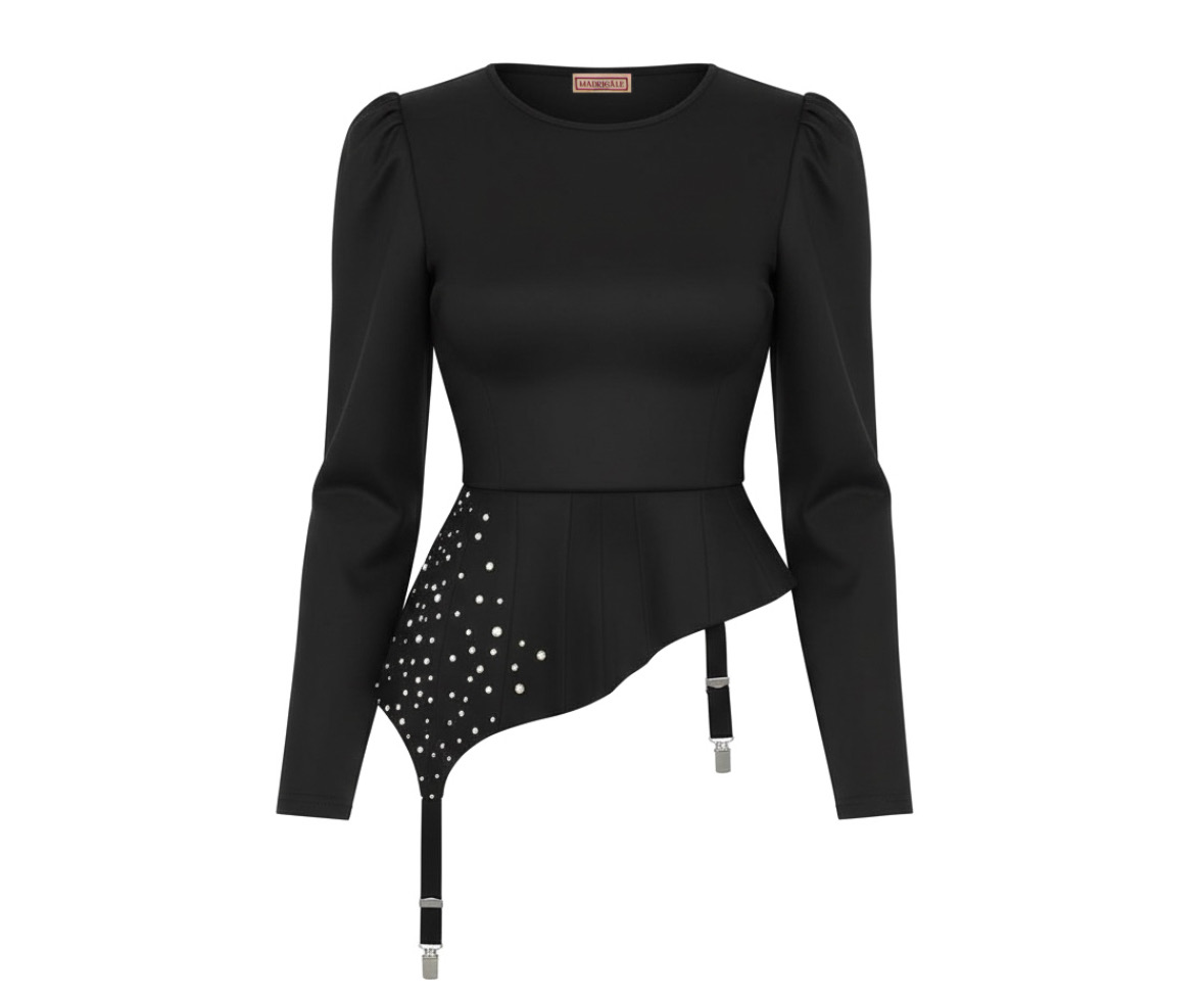 Лонгслив с баской — это элегантное дополнение к любому образу. Изготовленный из плотной ткани, он создает изящный силуэт. Баска СО СТРАЗАМИ придает изделию особый блеск и шарм.