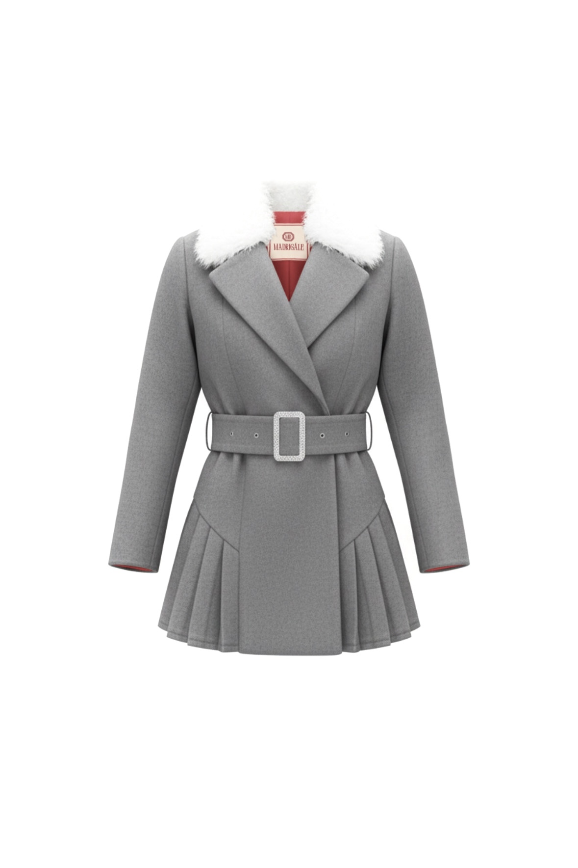 Акцентный пояс мягко фиксирует талию, формируя изящный силуэт. Длина мини делает образ лёгким и современным, визуально удлиняя ноги, а насыщенный красный подклад бросает изящный контраст при каждом движении — это маленькая деталь, которая делает пальто по‑настоящему запоминающимся.