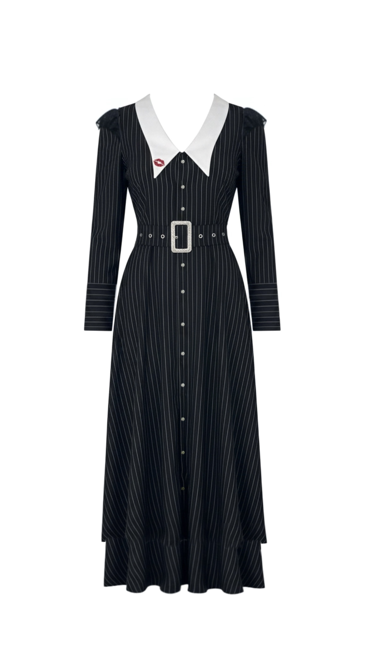 Его классический принт в полоску и акцентный пояс подчеркивают талию и создают элегантный силуэт. Крылышки из кружева на плечах добавляют романтичности.